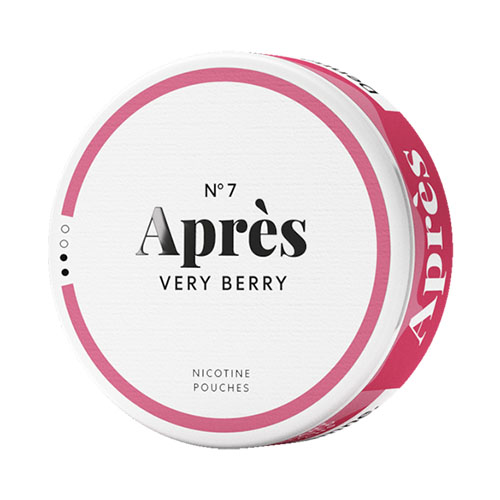 Après No.7 Very Berry är tobaksfria nikotinpåsar i slim-format med en mix av vilda bär och tydliga hallonton. Produkten levereras i en dosa med 20 portioner.