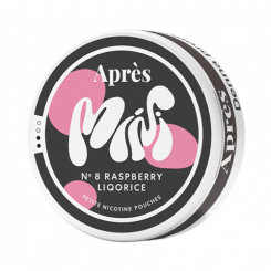 Après No.8 Raspberry Liqorice – Mini är tobaksfria nikotinpåsar i mini-format med en kombination av hallon och lakrits. Produkten levereras i en dosa med 20 portioner.