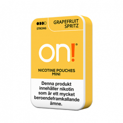 on! Grapefruit Spritz Regular kommer i mini-portioner. Smakprofilen anges som grapefrukt; vita vinbär nämns i profilen. Styrkan är normal. En dosa innehåller 20 portioner och nikotininnehållet är 3 mg per portion (≈ 9,5 mg/g). Nettovikt: cirka 6,4 g; portionsvikt: cirka 0,32 g.