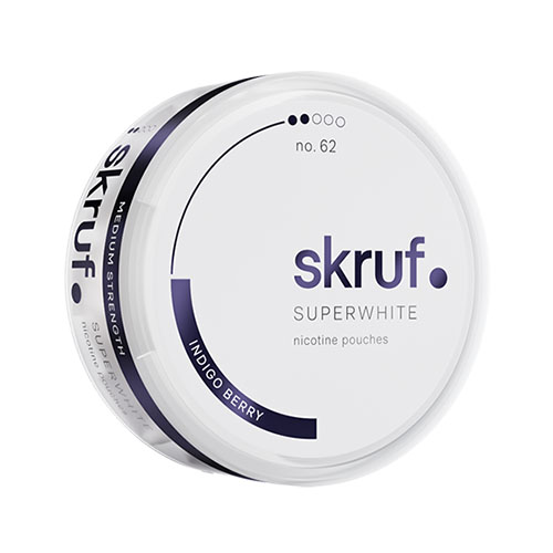 Skruf Superwhite No.62 Indigo Berry är en tobaksfri nikotinpåse i slim-format från Skruf Snus AB. Produkten ingår i Skruf Superwhite-serien och tillhör kategorin vitt snus. Smakprofilen är bär med kylig ton. Nikotinstyrkan är normal: 6 mg per portion (≈ 8 mg/g). En dosa innehåller 24 portioner.