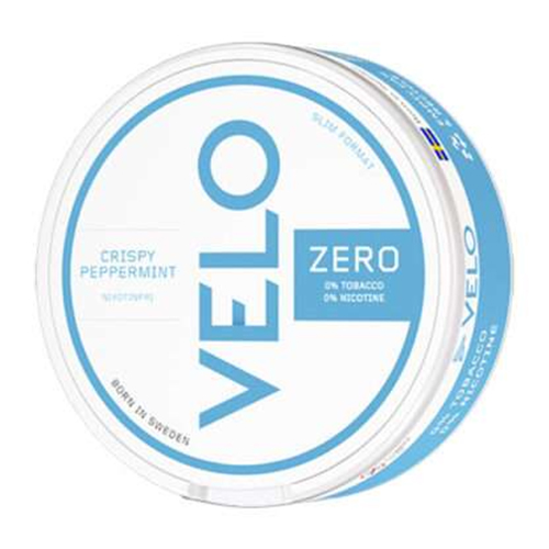 VELO Crispy Peppermint Zero är ett nikotinfritt och tobaksfritt vitt snus i slim-format med smakprofil av pepparmint och mint.