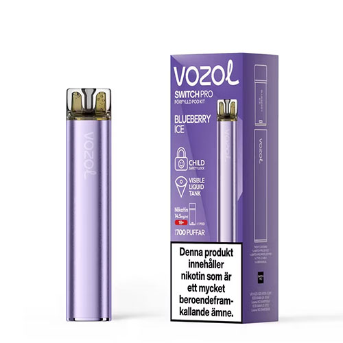 Vozol Switch Pro är ett förfyllt podsystem med uppladdningsbar enhet och utbytbara pods. Enheten laddas via USB-C och är avsedd för MTL-användning med förfyllda pods på 2 ml och nikotinsalt 14,5 mg/ml.